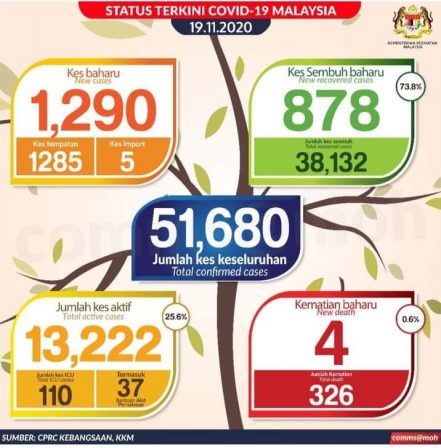 11/19のマレーシアの新規新型コロナウィルスの感染者数1,290名です。
