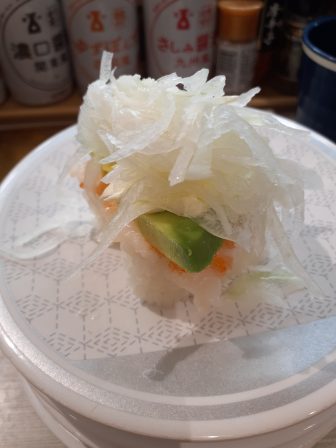 "アボガドとオニオンのサーモン寿司"、お店ではサーモンアボカドと言ってます。