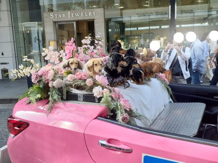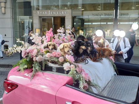 車の後部座席に、たくさんの犬 いぬ いぬ・・・・・・。ダックスフントDachshund。