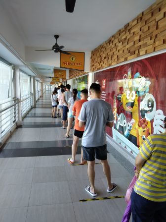 「線路は続くよどこまでも・・」行列はぐるぐる伸びています。